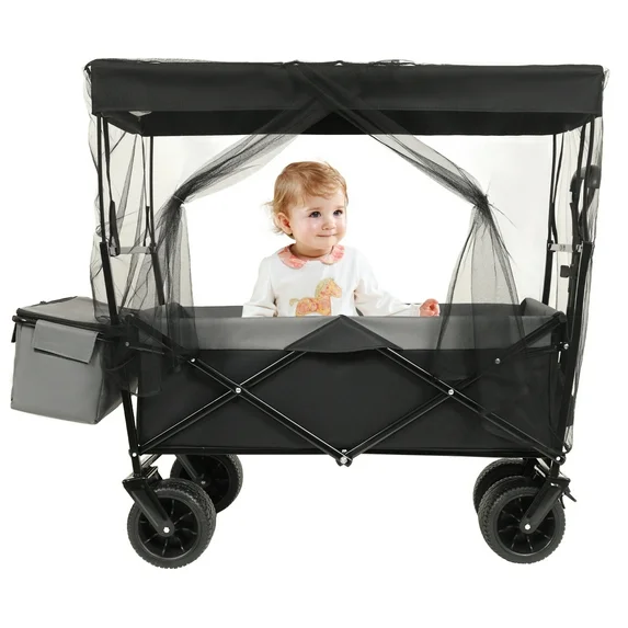 Kumix 480Lbs Collapsible Wagon with Canopy, Wagon Stroller with 7" All-Terrain Wheels, Mosquito Net, Lightweight Foldable Wagon, Large Capacity for Camping, Shopping, Sports, and Garden Use, Black quantity