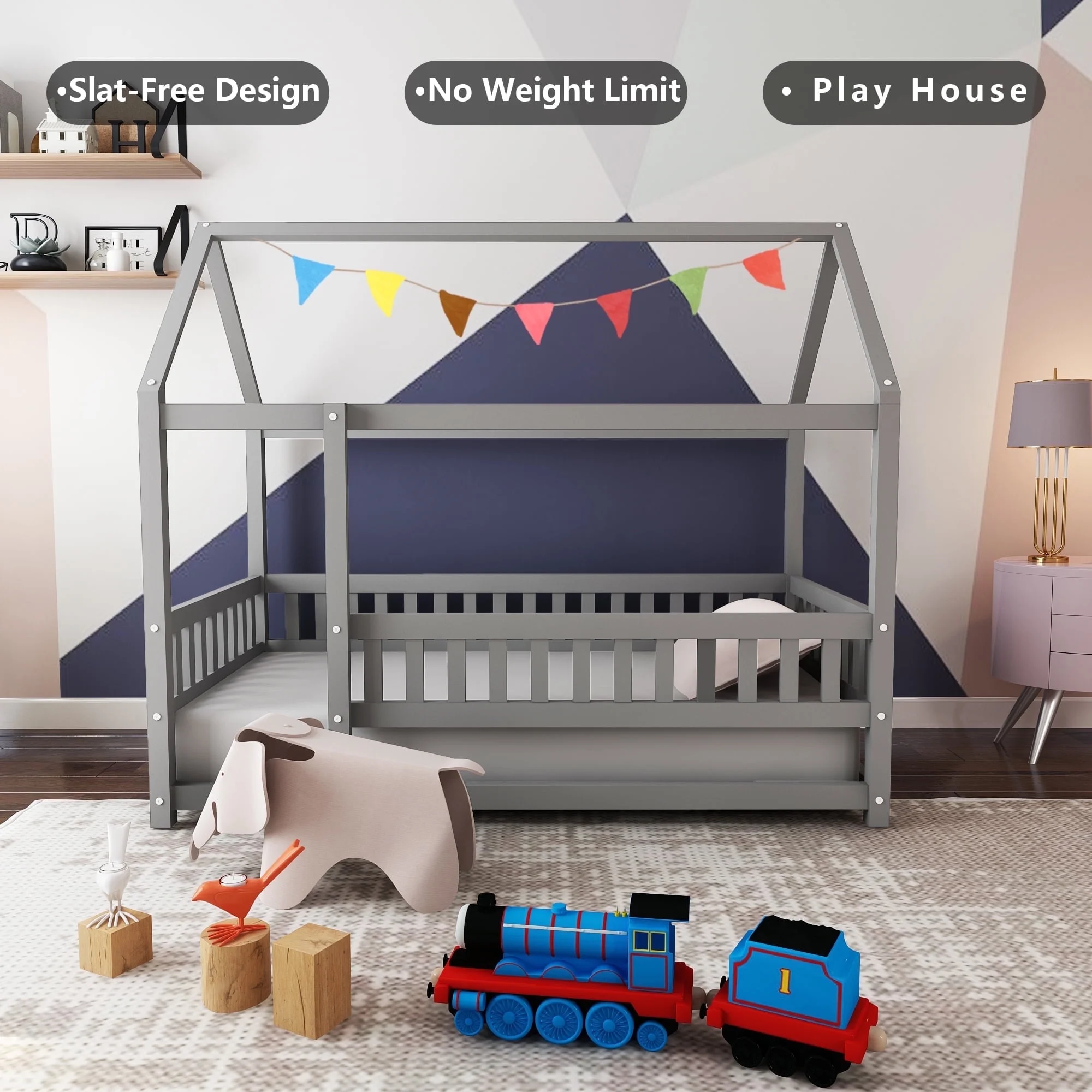 You're viewing: Kumix Twin Size Floor Bed with House Roof Frame, Fence Guardrails, Wood Floor Bed for 1-3 Aged, Twin Floor Bed for Boys/Girls, No Weight Capacity Limit, Noise-Free, Grey$199.99