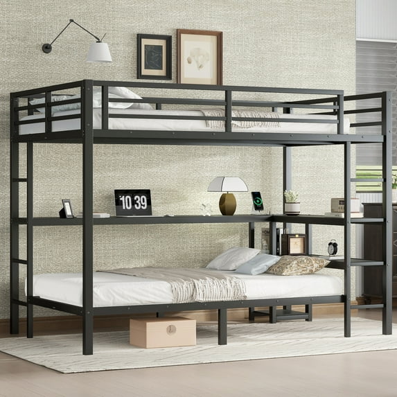 Kumix Full over Twin Bunk Bed with Desk and Shelves, Multiple Placement, with LED and USB, Metal Bunk Bed for Teens Adults, Black quantity