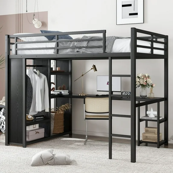 Kumix Full Size Loft Bed Frame with Built-in Wardrobe, Metal Loft Bed with Desk and Storage Shelves for Teens Adults, Space-Saving, Black quantity