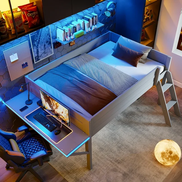 You're viewing: Kumix Gaming Loft Bed with Desk and LED, Wood Full Size Loft Bed with Full-Length Guardrail and Ladder for Kids Teens Adults, Heavy Duty Low Loft Bed Frame for Bedroom, Noise-Free, Grey$599.99