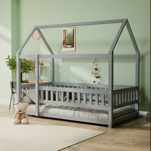 You're viewing: Kumix Twin Size House Floor Bed, Wooden Floor Bed with Fence and Roof, Unlimited Weight Capacity House Bed for Teens, Playhouse Twin Bed Frame for Girls, Boys, Gray$199.99