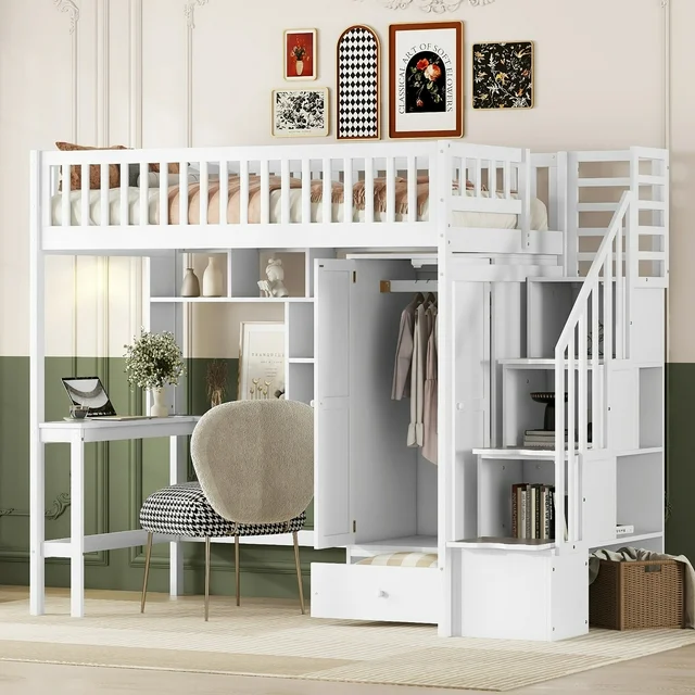 You're viewing: Kumix Loft Bed Twin Size with Desk, Wood Loft Bed with Bookshelf, Drawers, Storage Staircase Full Length Guardrail and Wardrobe, Heavy Duty Loft Bed for Kids Teens Adults, Space-Saving, White$899.99