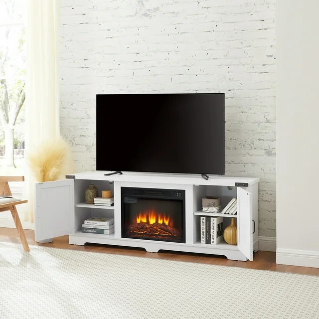 Kumix Modern Farmhouse TV Media Stand, Large Barn Inspired Home Entertainment Console, with 23″ Fireplace Insert, for TV Up to 70”, with Open Shelves and Closed Cabinets, White