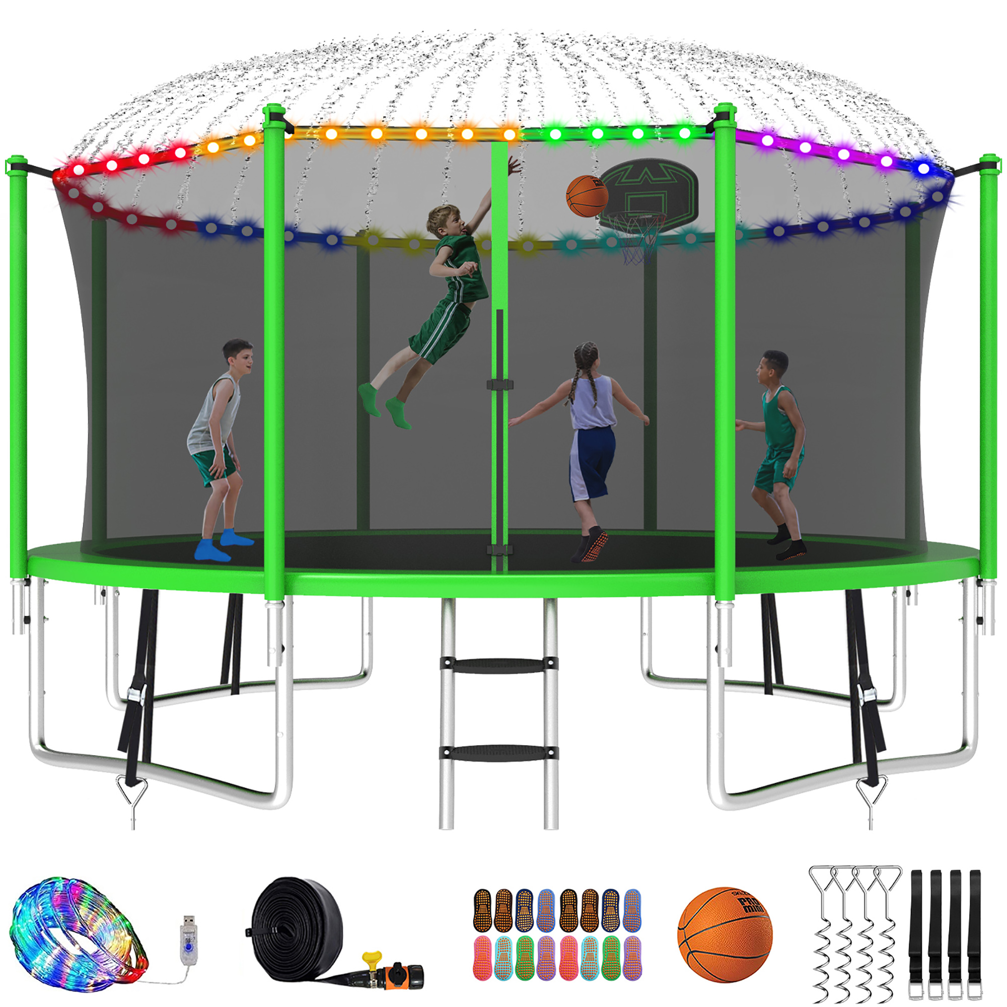 Kumix Trampoline with Enclosure Net for Kids and Adults, 1400LBS Capacity 14FT Trampoline with Basketball Hoop, Ladder, LED Lights, Sprinkler, Socks, Wind Stakes, Outdoor Heavy Duty Trampoline, Green
