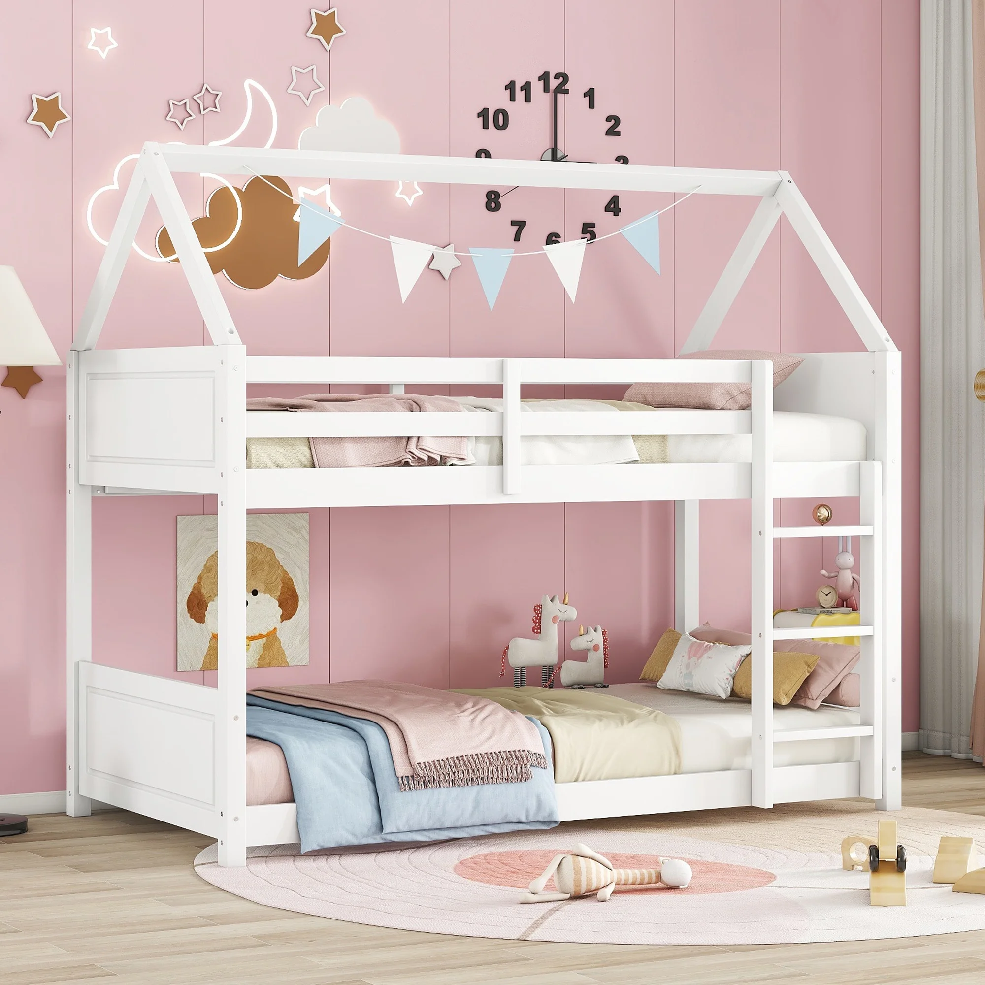 Kumix Twin over Twin Bunk Bed, House Bunk Bed with Full Length Guardrail and Build-in Ladder, Wood Floor Bed for Kids Teens Boys/Girls with Roof, 2 in 1 Bunk Beds, Noise-Free, White